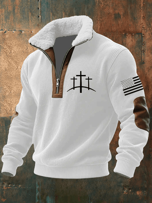 Men's Faith Print Knitted Fabric Zipper Fur Collar Long-Sleeved Sweatshirt