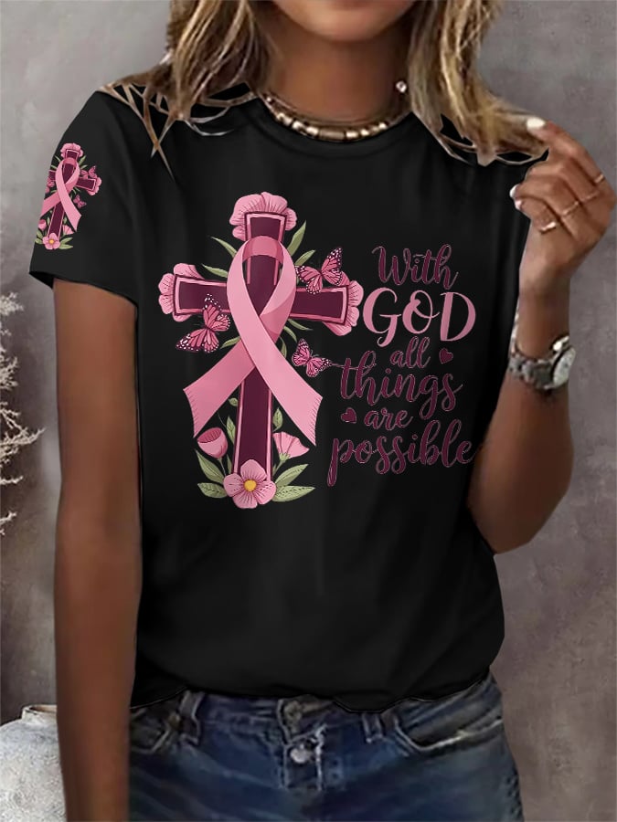 Retro Breast Cancer Awareness Pink Ribbon With God All Things Are Possible Print T-Shirt