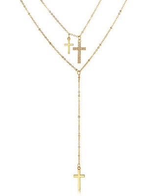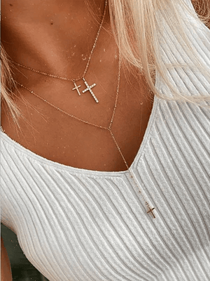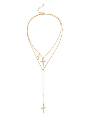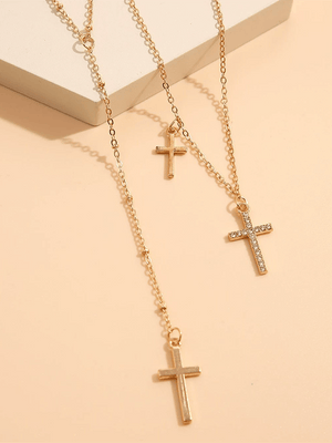 Stacked Multi-Layer Design Necklace With Rhinestone Cross