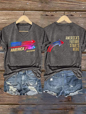 V-Neck Retro America Fest 2025 America's Future Starts Here Print T-Shirt