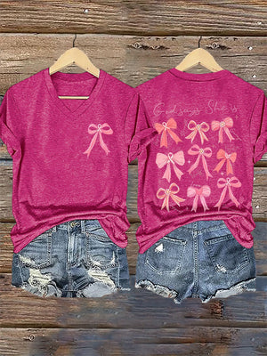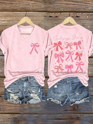 V-Neck Retro Breast Cancer Awareness Bow God Says She Is Hope Strength Courage Faith Unity Fight Support Love Survivor Print T-Shirt