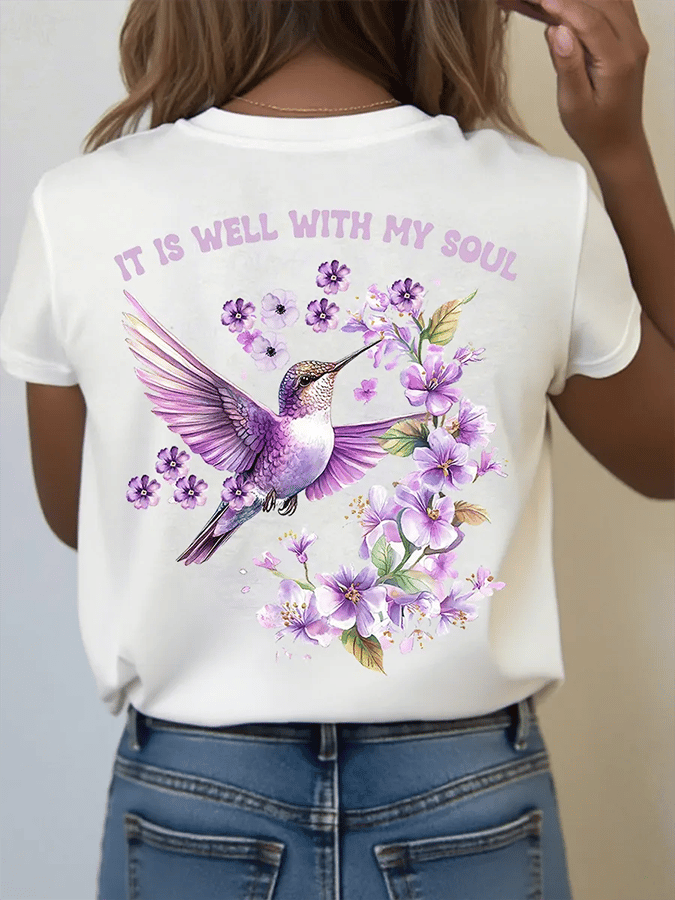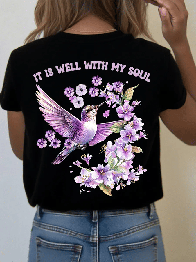 Women's It is Well With My Soul Floral Hummingbird Print T-Shirt