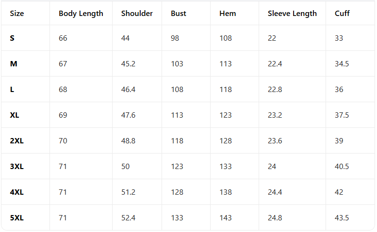 S, M, L, XL, 2XL, 3XL, 4XL, 5XL |